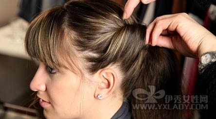 第四步:这一步我们需要从刚才整好的马尾中抽出一缕头发,用它绕住刚才的发箍或橡皮筋,缠几圈之后用bobby夹固定在马尾下面。