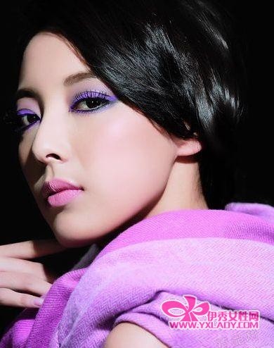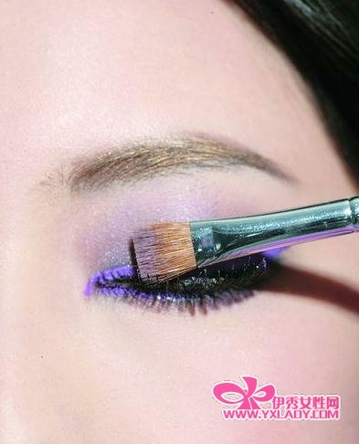 将肉粉色涂满眼窝,然后用深些的粉紫色从内眼角开始向外眼角呈“W”形描画,强调眼睛的立体轮廓。