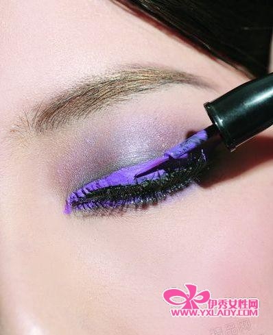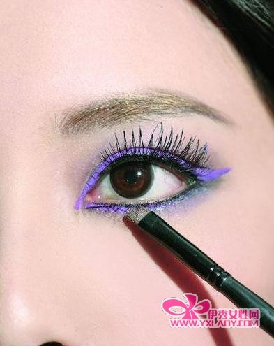 紫色眼线液从内眼角开始,沿着上眼线描画