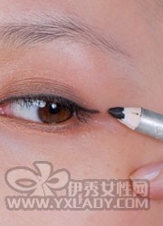 眼角的部分轻微上扬可以让眼型更完美,画眼线时只需要在眼尾的部位稍稍向上拉长即可,要一笔完成才有流畅感。