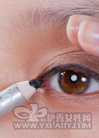 稍稍提拉眼皮露出眼头位置,顺着眼头的弧度,用眼线笔稍微勾勒一下,也可适当延伸出一点,会使眼睛看起来长一些。