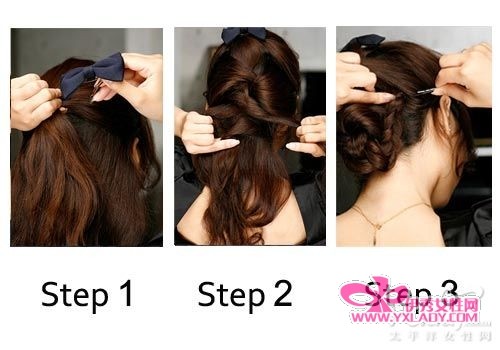 1. 先将刘海理顺,将刘海两侧少量的头发分出来,拉到头后面,用蝴蝶结固定,蝴蝶结不需要很大,颜色可与当天的服饰搭配。