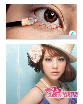 沿着睫毛根部描绘浅蓝下眼线,轻轻晕开创造晶亮卧蚕效果。