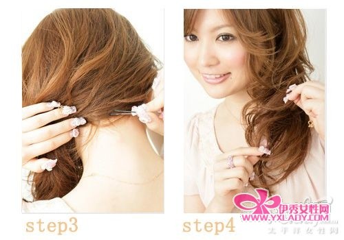 Step2:将头发全部抓到侧边,并用力向内旋转。