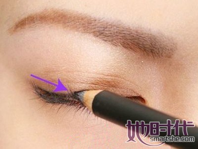 下眼线也是同样的,从外眼角往内侧拉线,画的流畅一点,然后用棉花棒使其晕染,晕染眼线效果更自然。