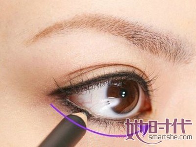 下眼线也是同样的,从外眼角往内侧拉线,最好画的流畅一点,然后用棉花棒使其晕染,晕染眼线效果更自然。