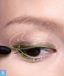 接着用棕色眼影着重在眼尾区域和下眼影后半段,深咖啡色眼影则描绘在睫毛根部和下睫毛后二分一处加强深邃感。
