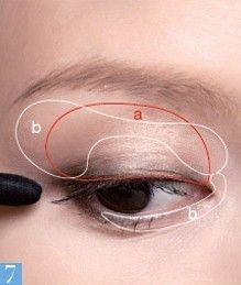 以最实用的大地色眼影为例,先用浅金色眼影涂上眼皮打底,再用肤色眼影涂在眼窝范围内,创造眼窝的凹陷立体感。