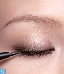 之前笔状眼线已和眼影自然融合,此时再用眼线液于睫毛根部描绘极细的眼线,以加强眼神和眼妆层次。