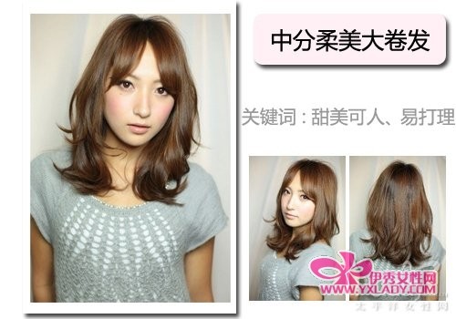 发型诠释:中分的短刘海可以消除传统长长的中分发拉长脸型的效果。这款卷发值得注意的除了那外翘和内卷交错的动活力卷度之外,有弹性的质感发丝也是一个重要元素,流露出在自然状态下的女性柔情,而且轻柔的卷发下垂更加显得脸型小巧精致。