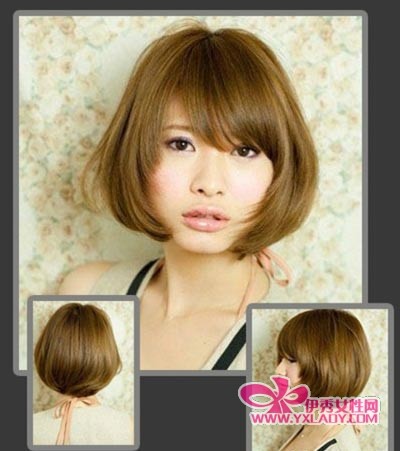 这是一款很柔顺的BOB头。栗色的发色,发尾全部向内卷。两侧的头发全都向脸部收,显得脸很小,所以也很适合圆脸的MM。整齐的刘海,稍微地向左分界,后脑的头发内卷之于,向最中心点收,时尚而柔美。