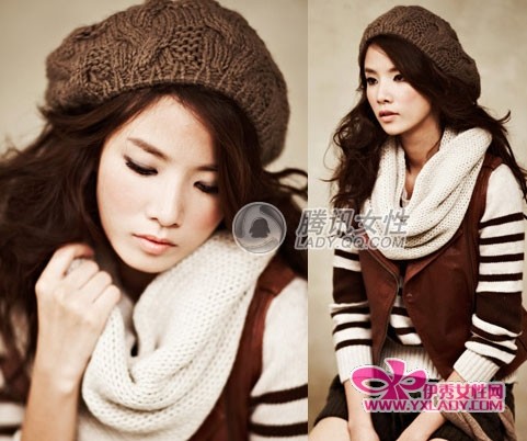 造型升级:奶茶系的针织圆帽,温情保暖又能帮助增加头部的体积,与蓬松粗棒针的围巾形成和谐比例。