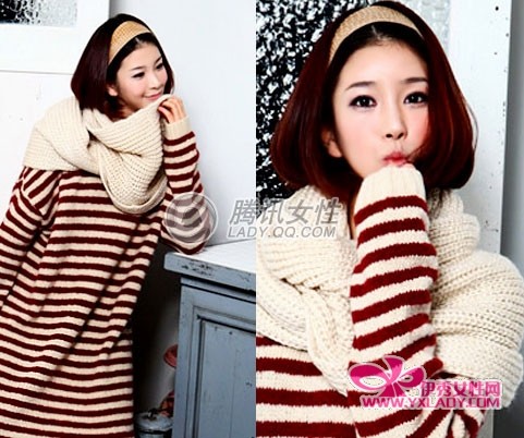 发型针织配:酒红色蘑菇头x条纹针织连衣裙