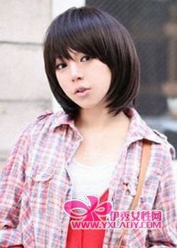 及肩的发型,圆滑的发型曲线呈现年轻的感觉,随意的不规则的过眉刘海,往内收的发尾很好地修饰了脸型,是baby face的MM很好的选择。
