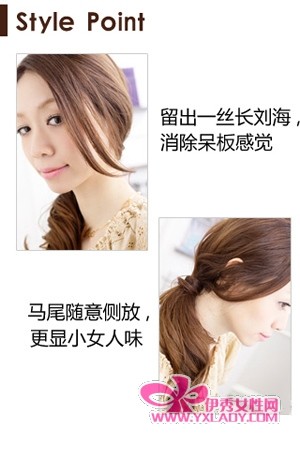 打造重点:绑好发尾后,从两侧的头发中抽出几条发丝垂在脸边、用头发缠住橡皮筋,这些动作的目的都是制作出温柔女生那种不经意的美,没有刻意打扮的感觉。