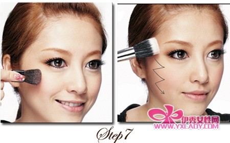 步骤分析:保持笑容,在颧骨的笑肌突出处刷上腮红打造红润好气色;修容粉采用“W”形的刷法,额头、发际线、脸颊两侧都是要进行修容处理的部位,修容粉记得不要来回揉拭,这样能更好地贴合肌肤纹理。
