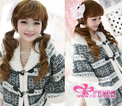 皮肤本身就很白皙的年轻MM冬季可以大胆尝试偏黄的栗子色染发,结合螺旋卷发来制造欧美小公主的气质。头发在两侧松松的扎成两个小辫子,利用卷发棒侧向下卷出法式面包卷造型,制造出俏丽跳跃的感觉,加入咖啡色深色挑染后会更增加立体感哦!