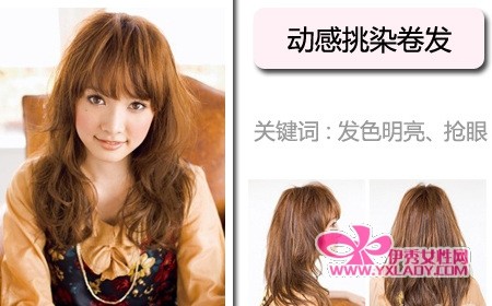 发型诠释:这是一款大波浪挑染卷发配上复古齐刘海的一款最新卷发发型。波浪卷发透出小公主的气息,配上一点流行的朱古力色+栗色挑染,让卷发更具有层次感,甜美中透出活力和动感,绝对能够令人眼前一亮。