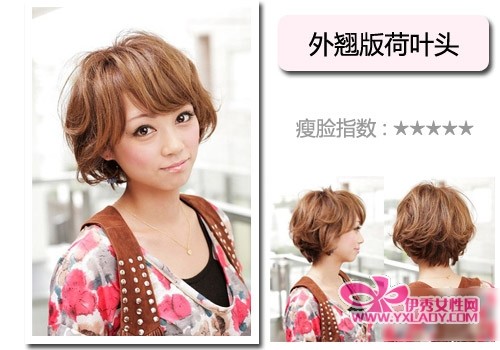 发型诠释:一般的荷叶头是上尖下宽,利用低层次头发造成的厚重发尾,大弧度内卷包覆脸部,形成瘦脸效果的。但是这一款改良过的外翘版荷叶头,特色在于它的发尾是大幅度外翻,形成一种自然的飘逸感,同时凌乱交错的小卷让脸颊两侧的发量增多,蓬松的效果让脸自然显瘦。