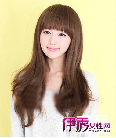 淑女与优雅的小女生经过齐刘海卷发发型的打造更能体现出迷人的一面,稀薄的齐刘海微微露出眉毛很甜美,上部直发与下部大波浪卷发的结合将脸型衬托的非常小。