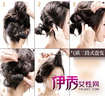 4、将步骤3固定后剩下的发尾,分成几束往下拉,与右下小发髻夹在一起。