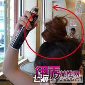用强力定型效果的定型喷雾,绕著丸子头周围喷一圈。