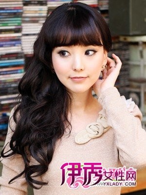齐刘海的制造出细厚之分,发尾向两侧各自做出微弯弧度。份量感十足的烫发发丝斜放至单肩,丰盈的卷发曲线形成跳跃的动感韵律。黑色的发丝彰显出明亮的光泽,尽显女生清纯的气质。显露出的颈部线条,很是优美。