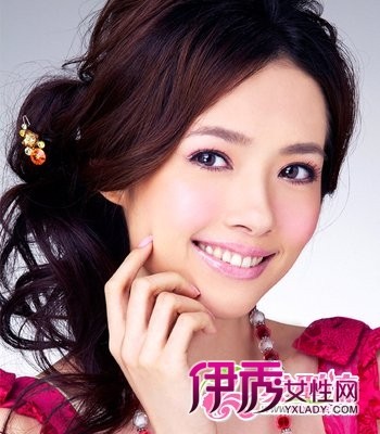 此款发型可能会稍显成熟,很适合较为知性的女性选择。将卷发收拢在一侧,拧绕出 发髻,余留出较长的发丝任其垂落。中分发型显露出漂亮的五官,精致的脸型轮廓一览无遗,色 系较为亮眼的彩妆,提亮了肤色,绽放出娇艳的美丽。