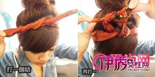 步骤六:接下来丝巾就要上场啦,可以选择各种花样的丝巾来装饰花苞头。