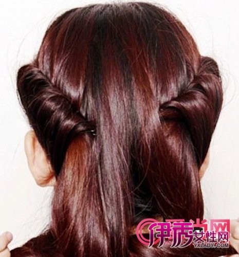 盘发教程七:把分开两个部分的头发交叉在一起,打成一个结。