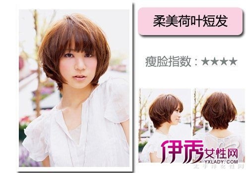 而上图这款短发最大的特点则是刘海和两边的秀发。刘海自然的线条遮住了脸蛋很大一部分,让你肉肉的脸蛋瞬间隐形,两边秀发打造的弧度则紧贴着脸部,很好地修饰了脸形,最后加上适当的蓬松以及内卷,不但显得可爱柔美,还有很好的瘦脸作用。