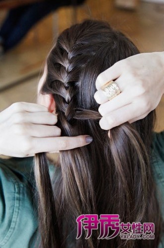 step2:从这三股开始编蜈蚣辫,将头顶部分的辫发稍微收紧,作为厚实的基础。在编发时,注意辫子的走势保持环绕整个头部的左侧。