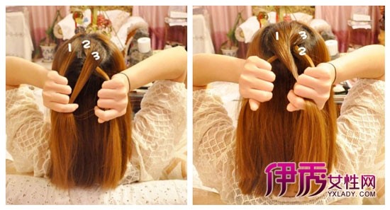step2:现将前面分出两小股,梳到前面。注意编后面头发的时候不要把这两股编进啦。最上面一层编成麻花辫,3股叠在2股上面。