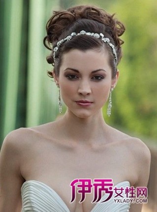 长发盘起,露出额头,精美的水晶发箍搭配上水晶吊坠耳环,高贵华丽,绝对让你成为最耀眼的新娘。
