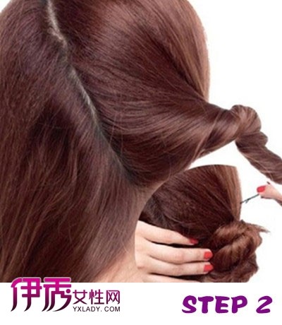 STEP2:将头顶区头发轻轻放下,和下面的头发一起顺时针扭转成一个丸子的形状,用黑色小夹子固定。