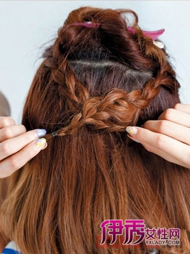 step2:再从前方左右两侧分别取出一束头发编织成麻花辫并在脑后重合固定。