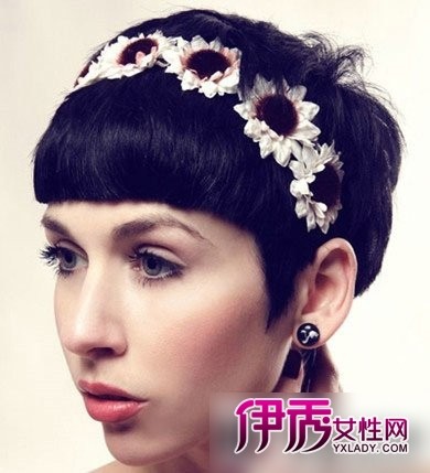 这款短发新娘发型发型的厚重齐刘海是个特色,配上冷色调的紫色染发,让新娘看起来独立干练,缠绕在头顶的向日葵发饰平衡掉了发色的冷感,给人一种夏日阳光的味道,让新娘看起来距离感不会太强。