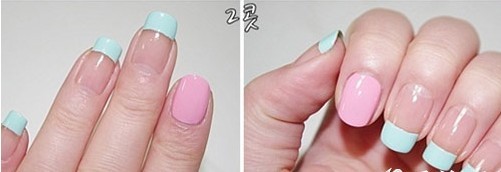 STEP2:这款指甲的主题是冰淇淋美甲,因此指甲油选择粉粉嫩嫩的草莓粉和薄荷绿。在食指涂抹上草莓粉的指甲油,剩下的四指的指端擦上薄荷绿的指甲油,做成法式指甲。