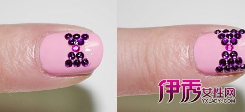 STEP4:粉色的食指指甲上,用水钻粘出蝴蝶结的形状。