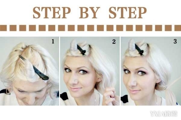 Step2:沿着发际把前额的头发汇成三角状,并用发夹夹起。