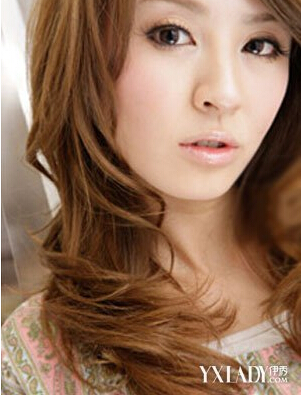 侧分的长刘海有效地把脸型缩小,从头发中部开始的大波浪卷发遮盖住了两颊部分,向下延伸的长卷发十分有女人味,适合发量多的女生。