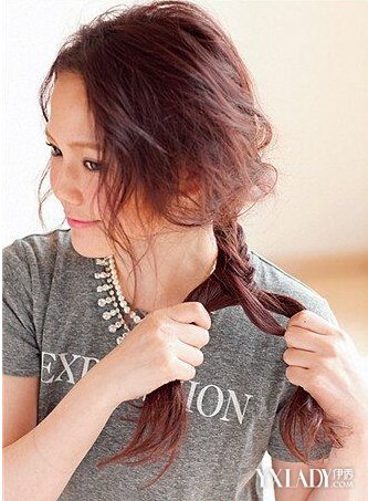 2、将1中的发辫和耳朵下方头发聚成一股,编成鱼骨辫(将发束分成2股,分别从发束的外侧取少许发丝添至内侧编织)。轻轻拉松发结营造随意感。