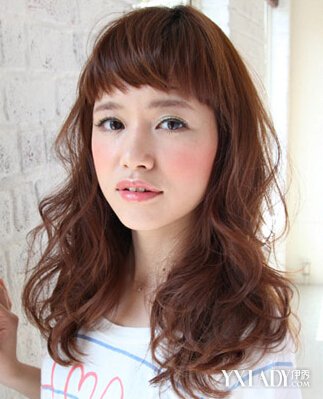 轻薄的齐刘海盖住宽大的额头,凸显女生的大眼睛之余还格外的显脸小,丰盈卷烫的梨花头时尚流行,散发女生魅力。