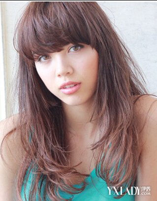 厚重的齐刘海虽然有一丝凌乱,但却给女生增添了几分慵懒美,稍微有些内扣的刘海完美的掩盖脸部缺陷,露出精致小脸,栗色的染发和女生的小麦色皮肤相互呼应,给人一种性感慵懒的美感。