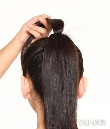 步骤1:先将头发梳成高马尾,然后从马尾的顶端取出一小股头发留做备用。