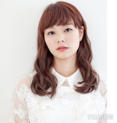 内敛的齐刘海,脸颊瞬间小一号,规则的卷发,酒红色的发色,如此时尚发型,简直是首选的国字脸女生发型。