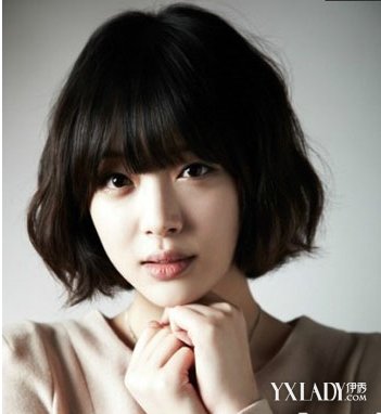清新自然的乌黑发色当然是最有修颜减龄效果的了,而配合厚重的齐刘海与中短发形式的蛋卷头烫发造型相搭更显女生的温柔甜美风,彰显的清新学院风更是迷人。