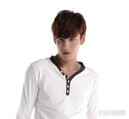 这款个性发型,齐齐的刘海向一边弯,遮住大大的额头,配上淡棕色的染发,想不帅气都不行了。