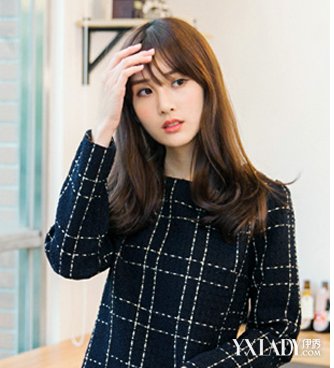 圆脸额头又高的女生选择发型当然要慎重了,棕色的中长发,简单的将发尾烫卷,展现出mm甜美的风格,斜刘海的设计很好的修饰了额头高的不足,塑造出一张精致的脸颊。