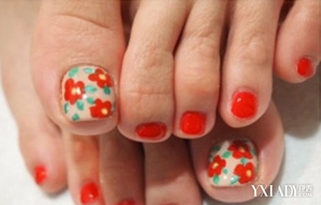 TOP1:小红花配绿叶,一看就是迎面扑来的春天气息,带着田园般的小清新,和邻家小女生的风格。永不过时,而且亮眼的红色指甲油可以使皮肤显白呢。